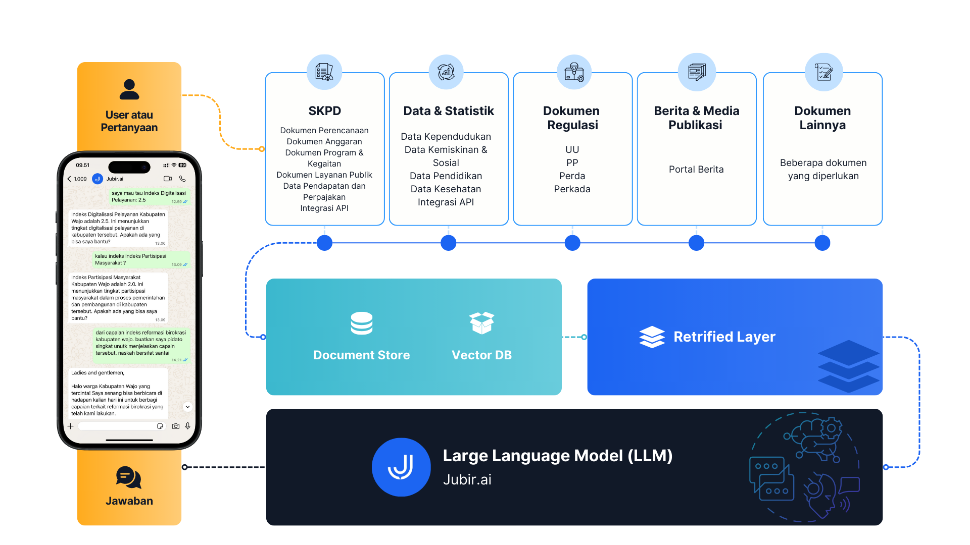 Jubir.ai menghadirkan solusi manajemen data & pengambilan keputusan berbasis kecerdasan buatan untuk membantu instansi pemerintah dalam mengelola informasi secara efisien dan membuat keputusan strategis yang lebih akurat.