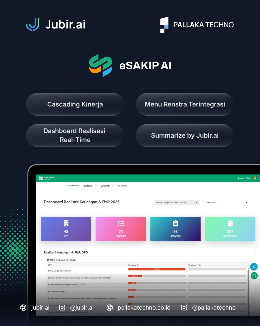 Transparansi adalah inti dari SAKIP. Melalui Dashboard Realisasi Real-Time, pimpinan dapat memantau progres fisik dan penyerapan anggaran kapan saja tanpa harus menunggu laporan bulanan manual.